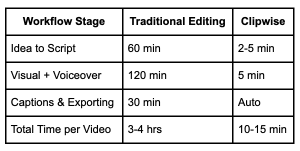 You’ll uncover how AI is revolutionizing the content game, turning raw ideas into polished short-form videos in minutes with zero editing skills required. Tools like Clipwise.ai are leading the charge, empowering creators nationwide to ditch the stress and embrace a seamless process. Imagine going from a spark of inspiration to a shareable Reel in under 15 minutes—yes, it’s that real! Check out this side-by-side chart comparing Traditional Tools (like Premiere Pro or CapCut) vs AI-Powered Tools (like Clipwise) to see the time-saving magic for yourself. Ready to transform your workflow and start creating viral content tonight? Let’s dive in!